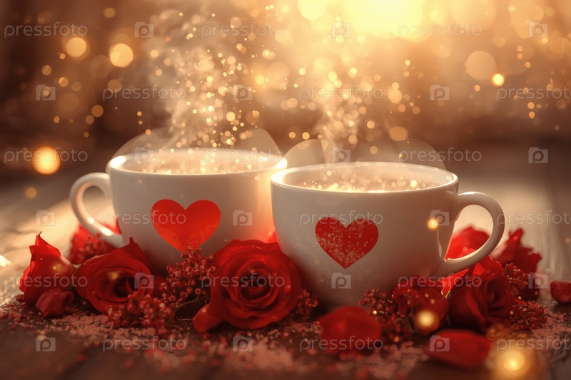Чашки горячего кофе или чая, окруженные красными цветами и сердцами в День святого Валентина