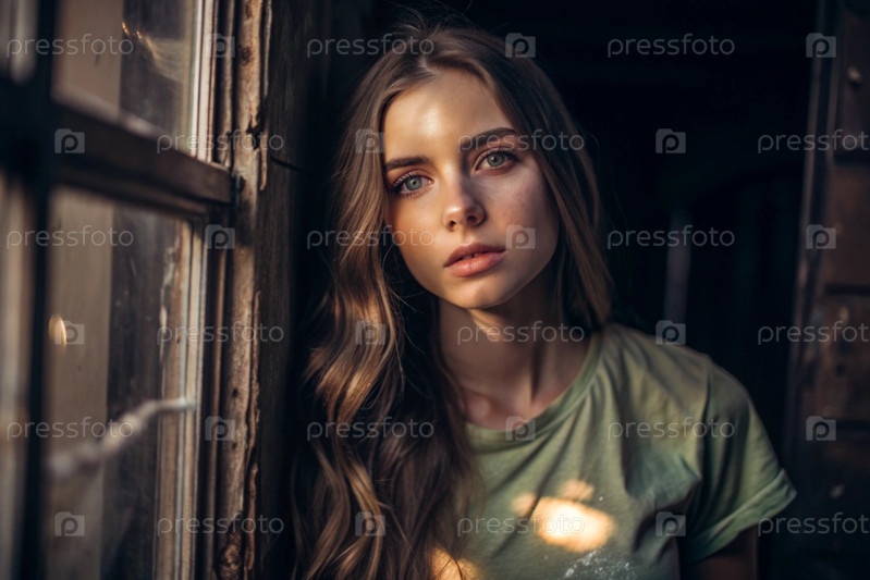Портрет красивой девушки с кудрявыми волосами у окна старого дома, в котором светит теплое яркое солнце. Романтическое изображение. Одиночество, пустота и ожидание