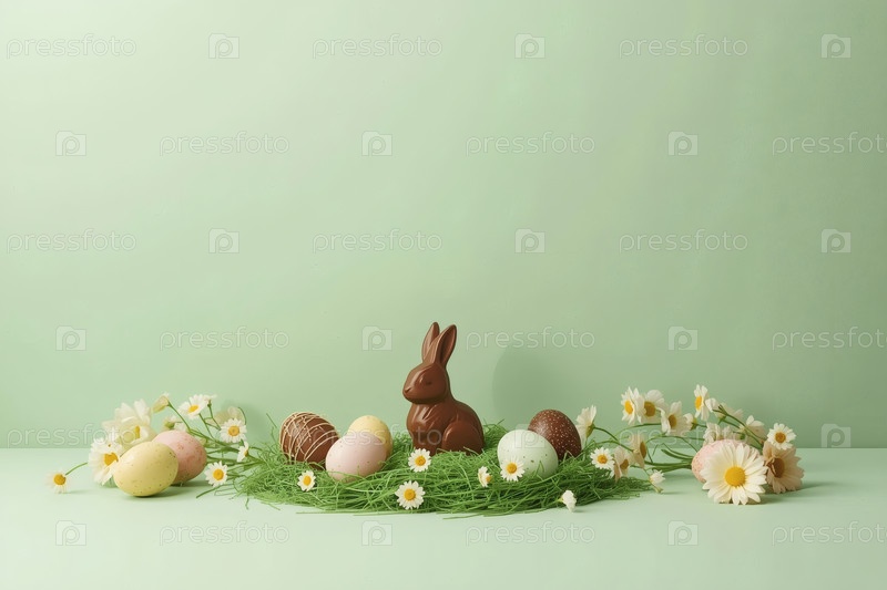 Счастливая Пасха 2026, минималистическое студийное фото. Шоколадный пасхальный кролик, пасхальные яйца и нежные весенние цветы. Мягкое освещение студии создает ощущение чистоты и воздушности