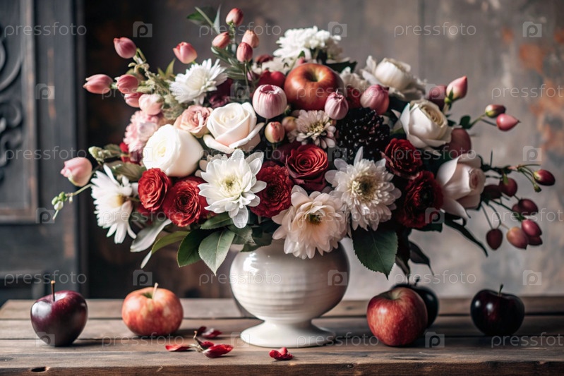 Красочное лето, осенний букет цветов различных красных, розовых, белых оттенков в вазе и спелые красные яблоки на столе