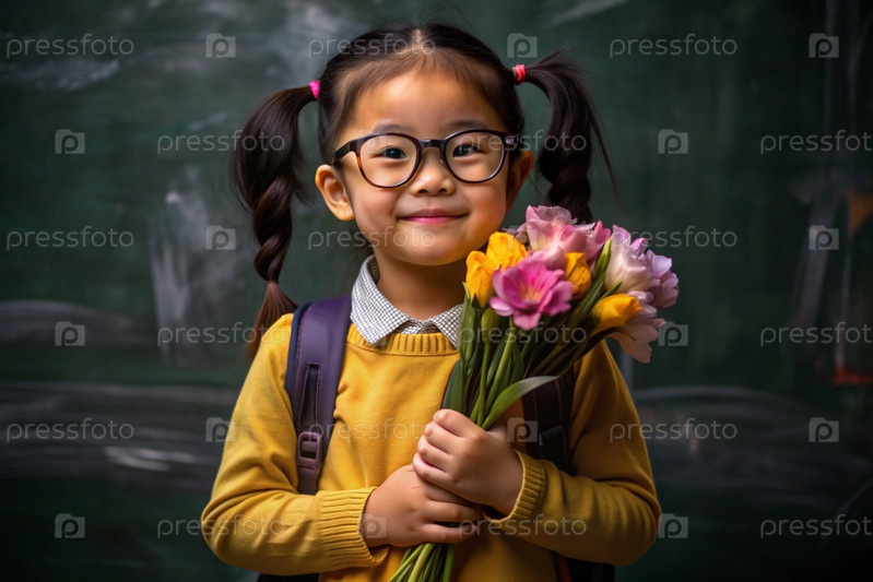 Первоклассный азиат с очками на доске. Девушка держит цветы в руках. Ребенок пойдет в школу впервые. Ребёнок с рюкзаком, книгой и цветами. Возвращение к школе
