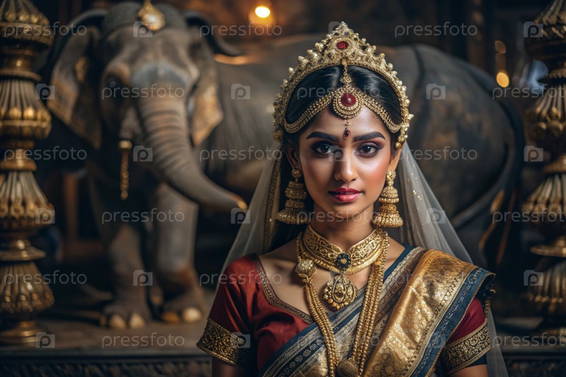 Красивая индийская девушка в традиционном национальном костюме, сари. со слонами. портрет символизирует традиции, культуру и красоту народа Индии
