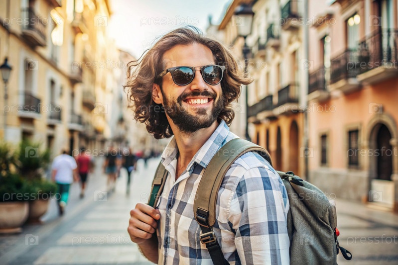 Портрет счастливого красивого хипстера-путешественника с рюкзаком и солнцезащитными очками. Сольное путешествие, образ жизни. Молодой турист наслаждается отдыхом в солнечный день