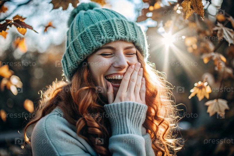 Осенний портрет. Близкий план молодой рыжеволосой женщины с ярко выраженными зелеными глазами в вязанной шляпе и свитере. Девушка смеется под лучами закатывающегося осеннего солнца