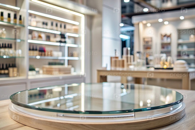 Минимальный фон для демонстрации продукта. Современная стеклянная подиум в современном магазине косметики. Элегантный дизайн для презентации косметической продукции