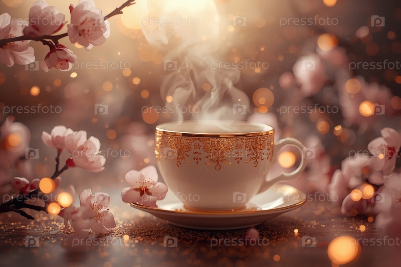 Нежные розовые вишневые ветви и чашка горячего чая на деревянном фоне. аромат