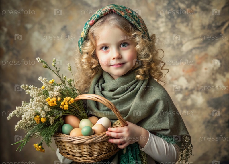 Счастливая Пасха. Христианство. Портрет трехлетней девочки с корзиной из плесеня и пасхальными яйцами в руках
