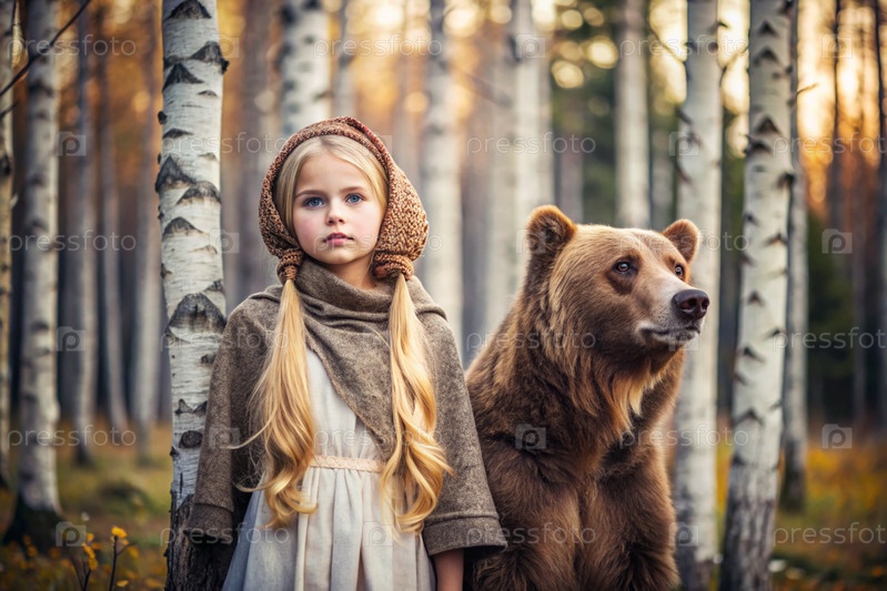 Красивая маленькая девочка в русской народной одежде и с платками на голове в березовой роще с живым медведем Русский фольклор, славянская мифология