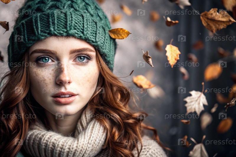 Осенний портрет. Близкий план молодой рыжеволосой женщины с выразительными зелеными глазами в вязанной шляпе и свитере