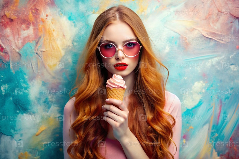 Молодая кудрявая девушка ест мороженое на улице в жаркий летний день