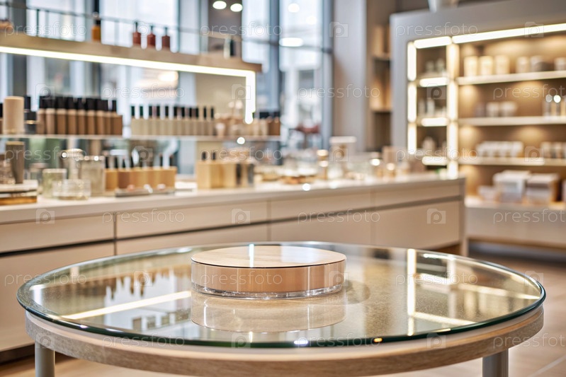 Минимальный фон для демонстрации продукта. Современная стеклянная подиум в современном магазине косметики. Элегантный дизайн для презентации косметической продукции
