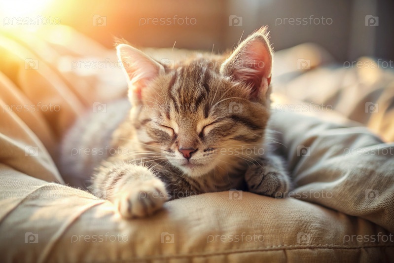 Милый котенок спит на подушке у окна.Кот удобно расположился в своем любимом месте, чтобы отдохнуть под солнцем
