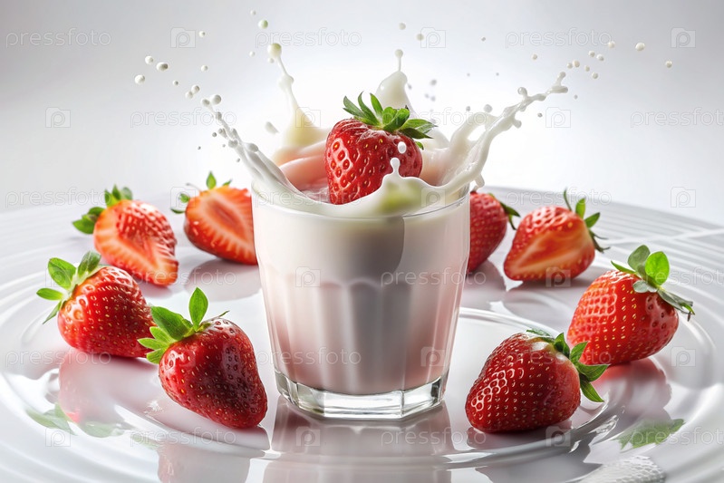 Творческий кулинарный рисунок. ближайшее наполнение клубники, клубника в стакане молока, розовый милкшейк, коктейль йогурта с жидкими каплями на белом фоне