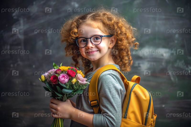 рыжеволосая скандинавская девочка со своими очками у доски. девушка держит цветы в руках. это ее первый раз, когда она ходит в школу. ребенок с рюкзаком, книгой и цветами. обратно в школу
