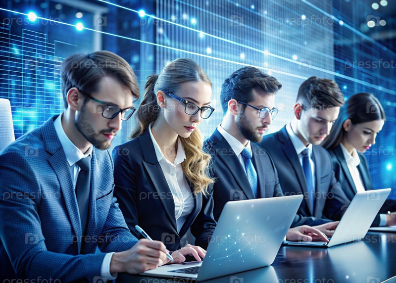 Молодой чернокожий мужчина, афроамериканец в костюме, работает в офисе за ноутбуком с цифровыми кодами на виртуальном экране