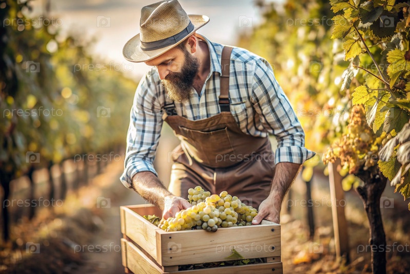 Сельскохозяйственная промышленность. Производство вина. Деревянный ящик с виноградом в руках фермера-мужчины. Садовник собирает богатый урожай. Ближе, солнечный свет. Осенний плодовый сбор