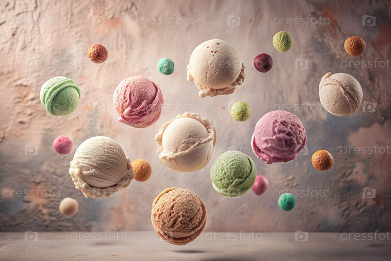 Сладкий, холодный десерт. шарики мороженого с различными вкусами. кремовое ванильное мороженое. баннер, реклама. Всемирный день мороженого