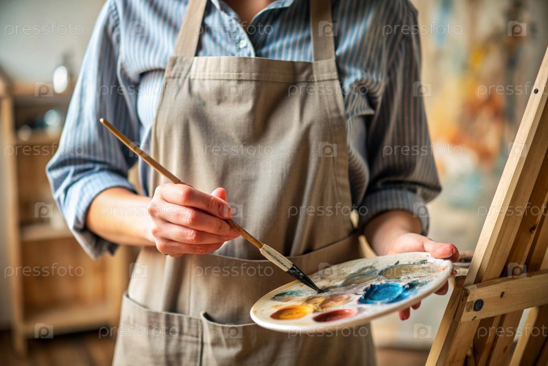 Близко. Понятие творческой деятельности. Художник в мастерской с маслом и кистью в руках. Искусство, креативность и отдых