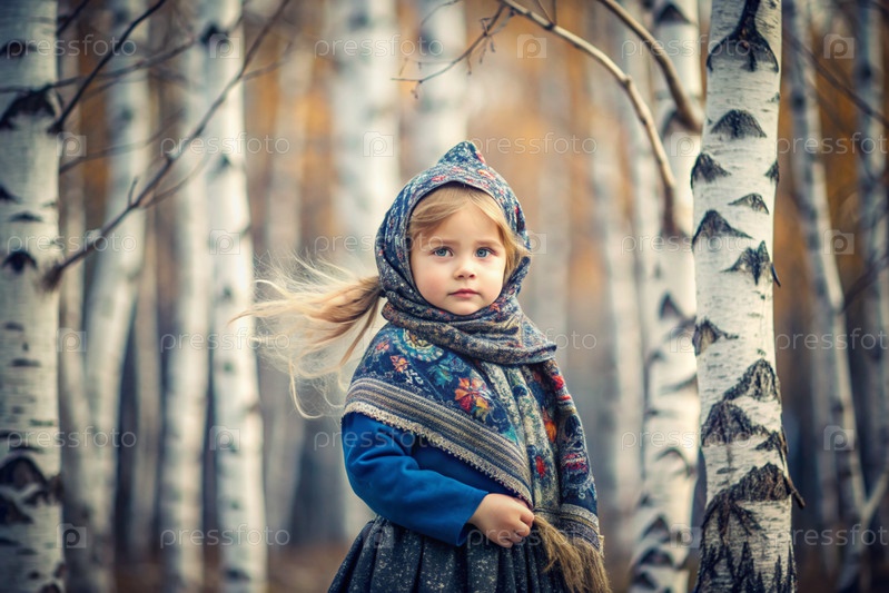 Русские народные традиции.Русский аромат.Красивая девочка в национальном русском платье и шарфе в красивом березовом роще.Портрет прекрасной девушки в березном лесу