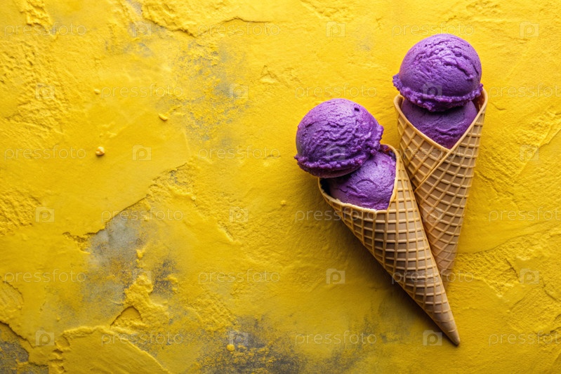 Сладкий десерт. Стильная современная концепция. Фиолетовый конус мороженого на ярко-желтом фоне. Всемирный день мороженого