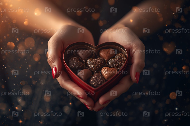 Руки женщины с подарком в форме сердца с шоколадом на День святого Валентина