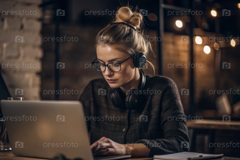 Молодая женщина фрилансер в очках и наушниках работает на ноутбуке или делает покупки в интернет-магазине