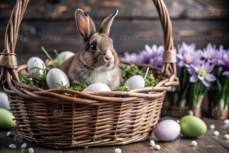 Баннер. пасхальный кролик в корзине из красочных пасхальных яиц вокруг весенних снегопадов и первичной розы. концепция праздника Пасхи