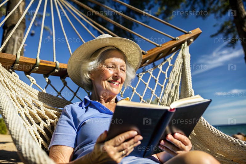 Пожилая пенсионерка, современная бабушка в очках, читает книгу на каникулах в гамаке у моря при естественном свете