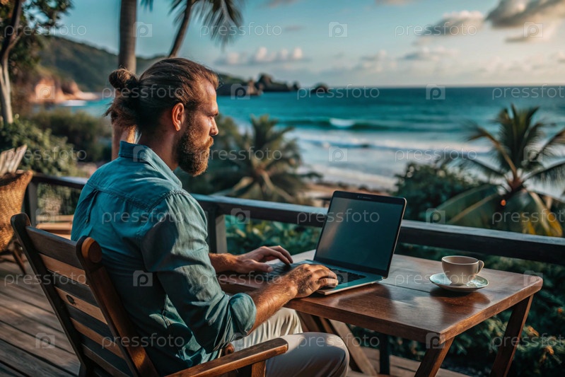 Молодой бизнесмен-фрилансер работает на ноутбуке, отдыхая у моря или делая покупки в Интернете