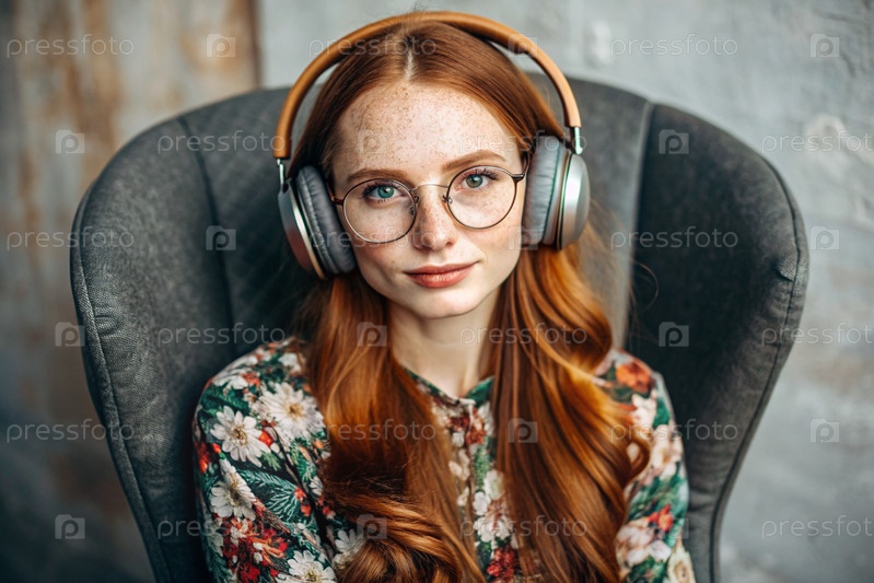 Молодая красивая рыжеволосая женщина с веснушками слушает музыку в больших беспроводных наушниках дома на стуле в гостиной