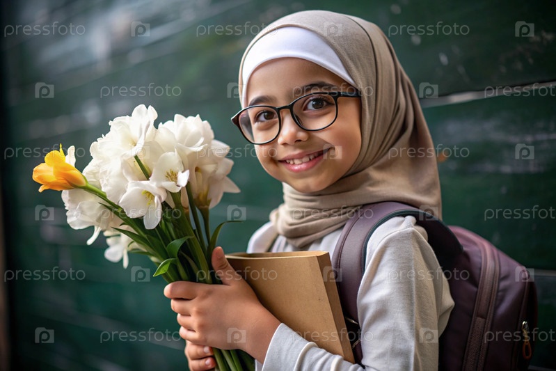 Первоклассник-мусульманин с очками на доске. Девушка держит цветы в руках. Ребенок пойдет в школу впервые. Ребёнок с рюкзаком, книгой и цветами. Возвращение к школе