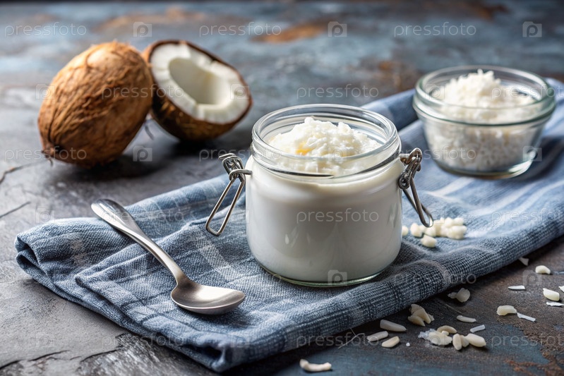 Домашнее ванильное блюдо, кокосовый йогурт со свежим кокосом, винтажная ложка и полотенце на стильном сером фоне
