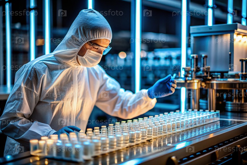 Производство лекарств: фармацевт тестирует медицинские флаконы на автоматическом трубопроводе фармацевтической производственной линии с использованием искусственного интеллекта