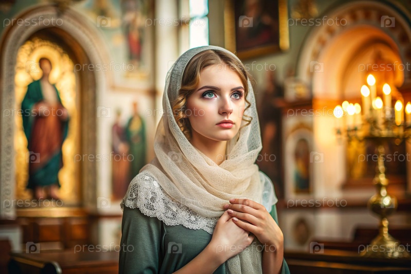 Портрет красивой молодой женщины с платками в православной церкви.Девушка молится в церкви среди икон