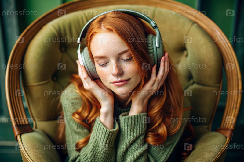 Молодая красивая рыжеволосая женщина с веснушками слушает музыку в больших беспроводных наушниках дома на стуле в гостиной