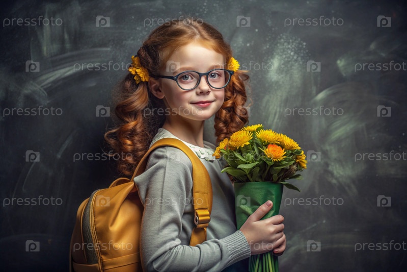 рыжеволосая скандинавская девочка со своими очками у доски. девушка держит цветы в руках. это ее первый раз, когда она ходит в школу. ребенок с рюкзаком, книгой и цветами. обратно в школу