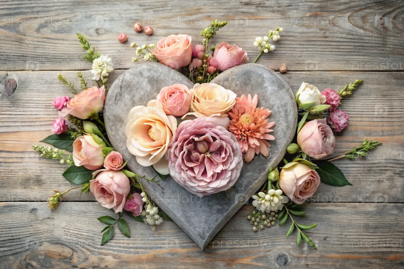 Открытка, баннер Дня матери с розовыми цветами, сердца на винтажном сером деревянном фоне