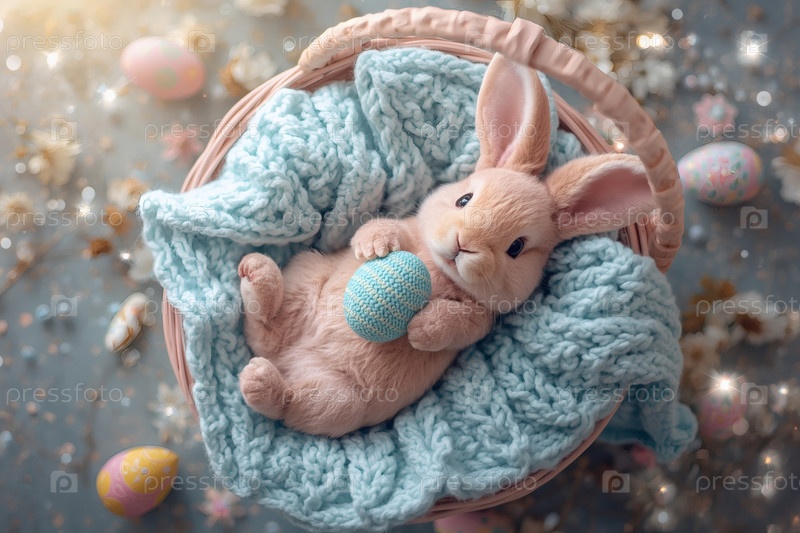 Пасхальный кролик пасхальное яйцо в лапах, лежащее на спине на сером вязанном одеяле в корзине из колючки и уставившееся в камеру