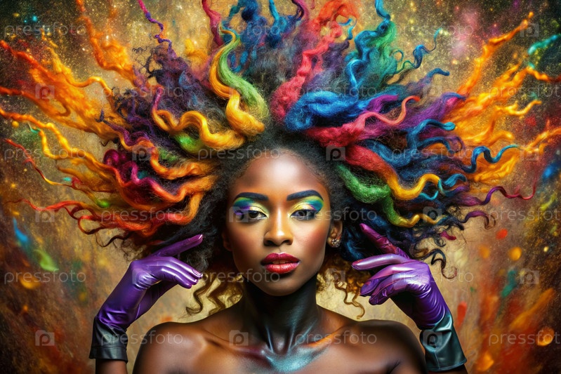 Творческий баннер для салона красоты или парикмахера. Модное профессиональное окрашивание волос. Красивая чернокожая афроамериканка с длинными многоцветными волосами. Взрыв цветов на голове