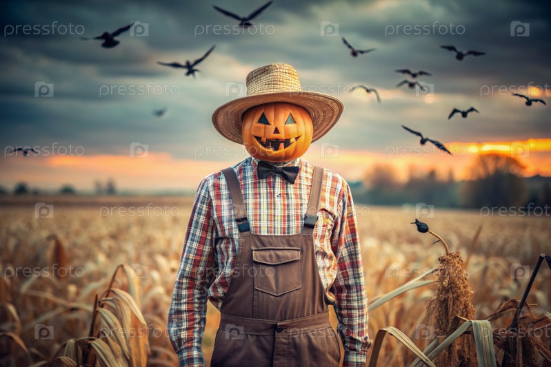 Концепция Хэллоуина. Ужасная. Страх. Устрашающий богий с тыквенной головой, квадратной рубашкой и бабочкой. Баннер, открытка