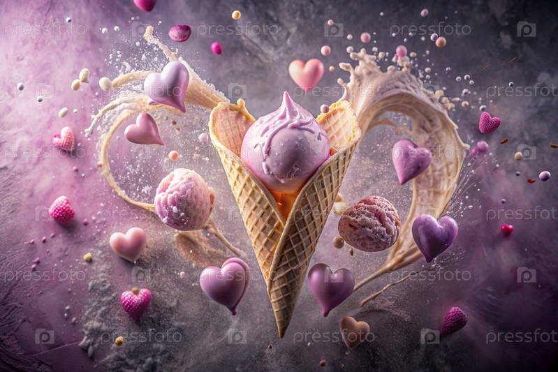 Сладкий десерт. Любовь к мороженому. Сердечно-образный конус мороженого с брызгами, сердцами и пятнами. Концепция Дня святого Валентина. Баннер, реклама