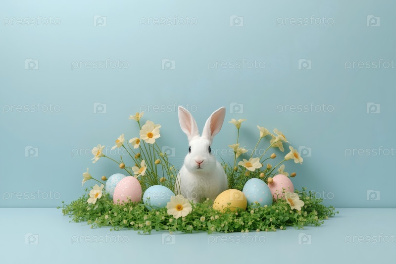 Счастливая Пасха 2026, минималистическое студийное фото. пасхальный кролик, пасхальные яйца и нежные весенние цветы. мягкое освещение студии создает ощущение чистоты и воздушности
