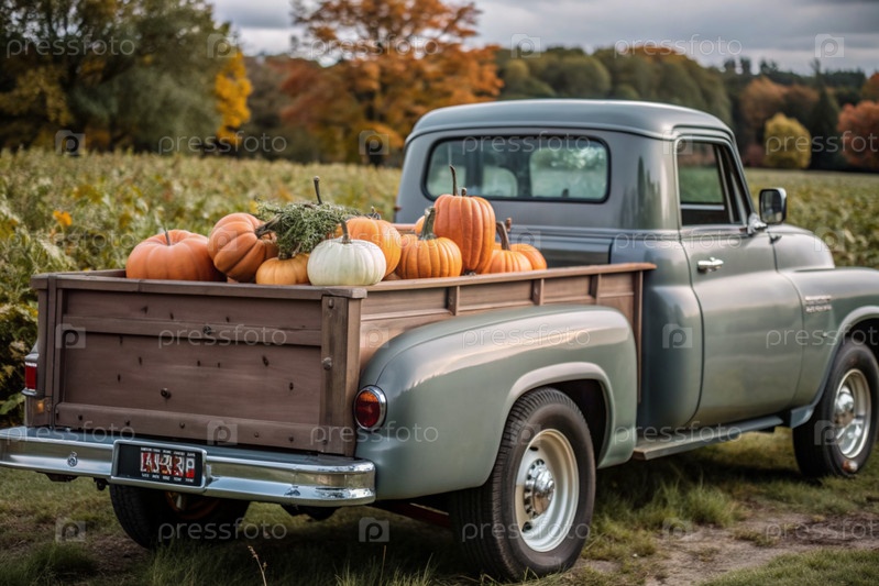 Осень, осенний дизайн.Большой урожай тыквы на заднем сиденье ретро-пикапа, крупный план