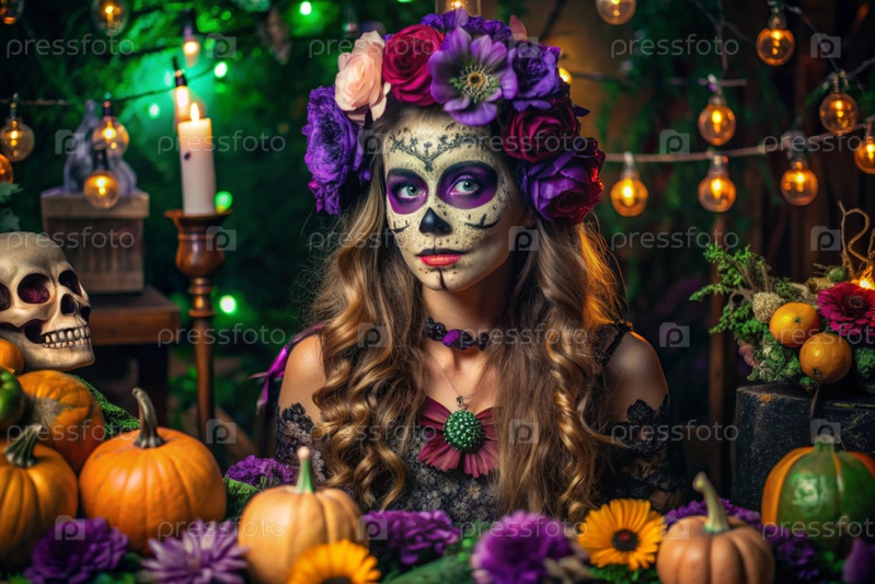 Концепция Хэллоуина. Ужасно. Костюмированная вечеринка. Красивая женщина с покрашенным черепом на лице и цветами на голове. Баннер, открытка