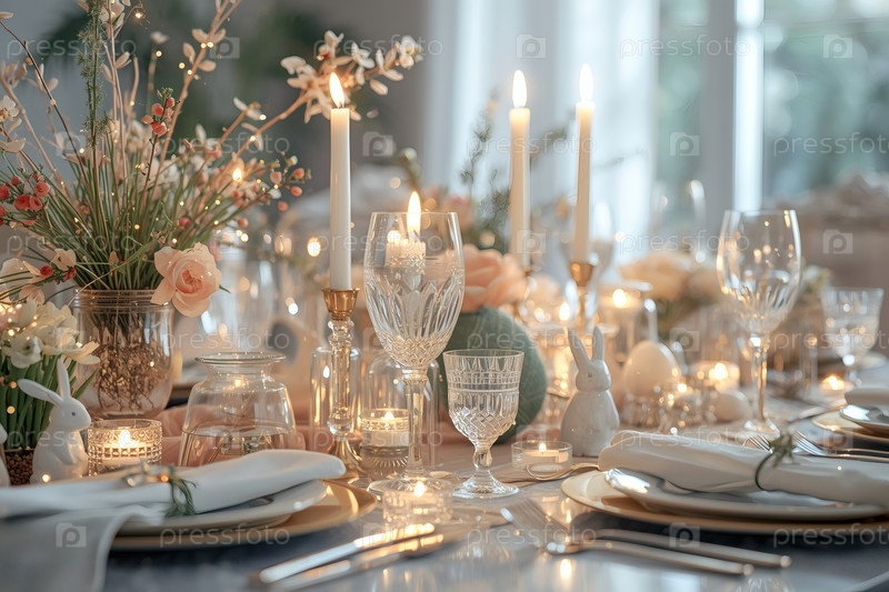 Пасхальный баннер 2026. декоративная тарелка, столовая посуда, стаканы, пасхальные яйца и кролики. концепция празднования Пасхи для кафе и ресторанов