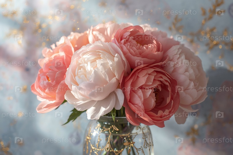 Букет мягких розовых коралловых пион в стеклянной вазе на синем фоне. Цветы и почки в вазе. светло-розовый, цветочный фон