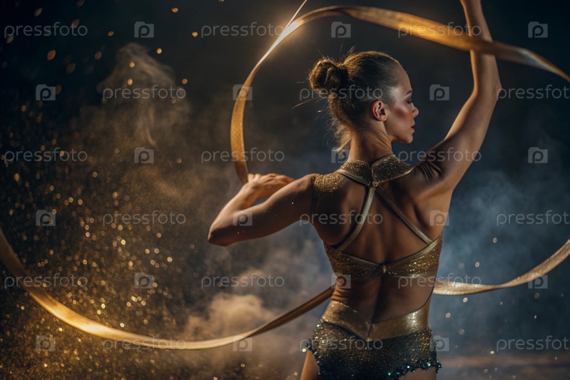 Ритмическая гимнастика - это крупный план красивой гимнастки с лентой в центре внимания на спортивной арене