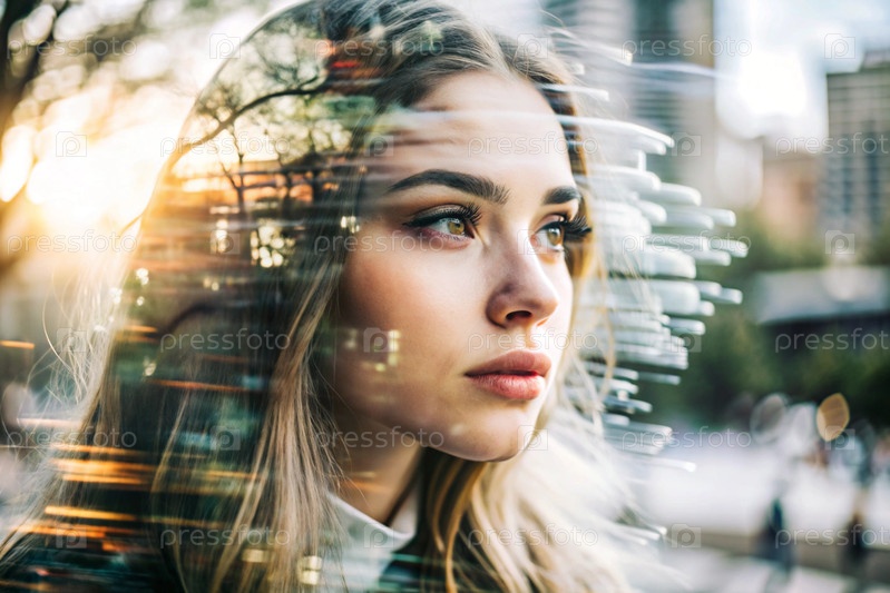 Портрет молодой женщины.Концептуальное искусство Клубовое изображение на фоне города с двойной экспозицией и визуальными эффектами
