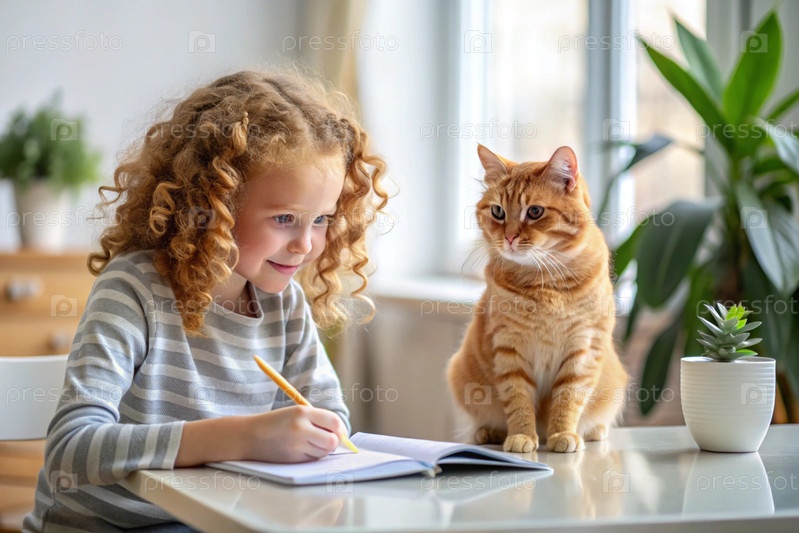Образование и обучение. маленькая кудрявая девочка делает домашнее задание. ученик выполняет школьное дома. рядом со мной сидит рыжеволосая кошка
