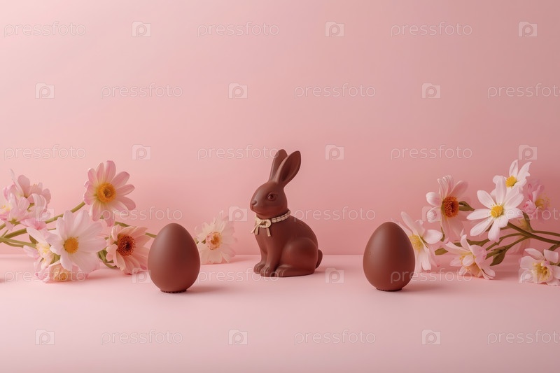 Счастливая Пасха 2026, минималистическое студийное фото. Шоколадный пасхальный кролик, пасхальные яйца и нежные весенние цветы. Мягкое освещение студии создает ощущение чистоты и воздушности